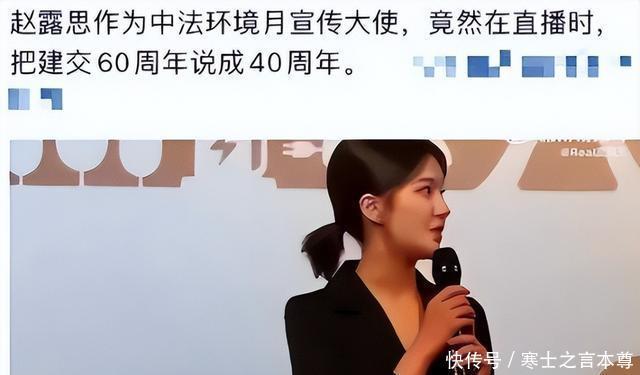 在一次重要的活动上,赵露思张嘴就捅出了篓子,原本应该是中法建交60周年,结果在赵露思的嘴里成了40周年, 而且更加离谱的是,她还是在工作人员的告知下才说出正确的时间,